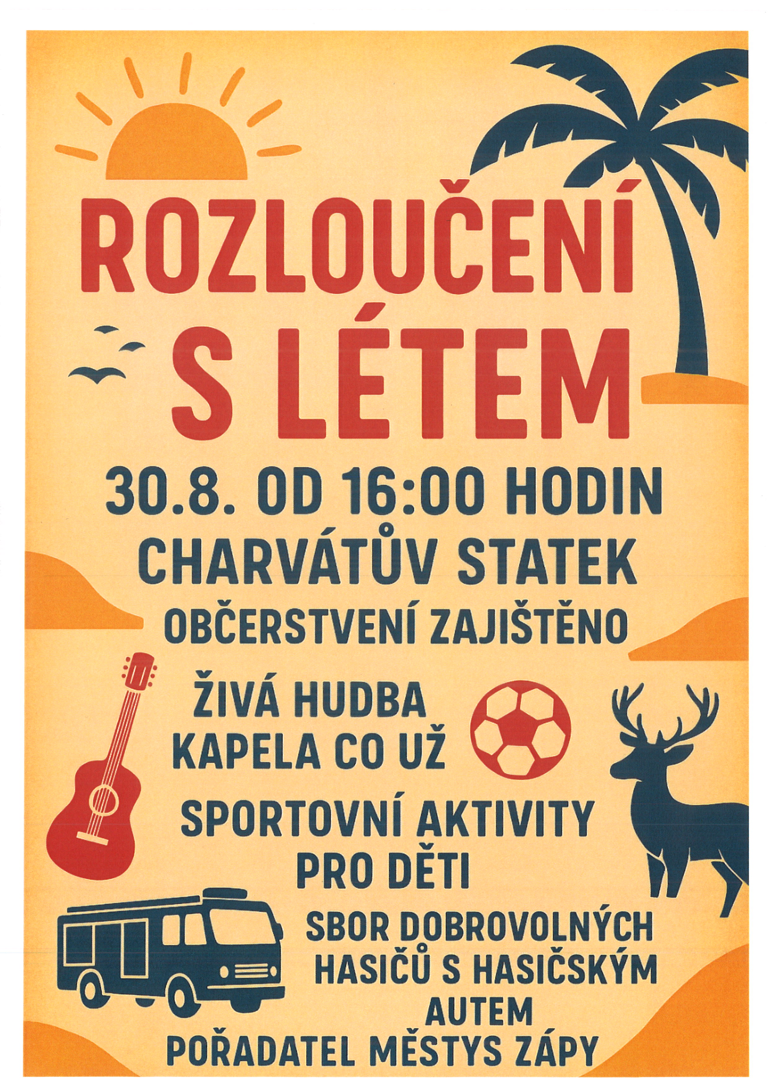 Městys Zápy srdečně zve na akci, která se koná 30. srpna od 16:00 hodin na Charvátově statku. Návštěvníci se mohou těšit na živou hudbu od kapely Co už, občerstvení a pestrý program se sportovními aktivitami. Akci podpoří také sbor dobrovolných hasičů s hasičským autem, což slibuje zajímavou podívanou pro všechny.