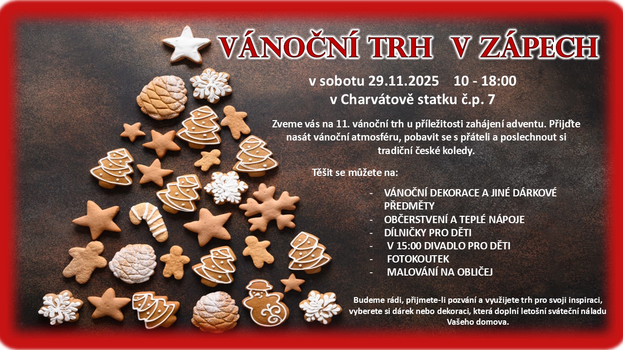 V sobotu 29. listopadu 2025 se v Charvátově statku č.p. 7 uskuteční 11. vánoční trh, který zahájí adventní období. Od 10 do 18 hodin si návštěvníci mohou užít vánoční atmosféru, poslechnout tradiční české koledy a setkat se s přáteli. Na trhu budou k dispozici vánoční dekorace, dárkové předměty, občerstvení a teplé nápoje. Pro mladé návštěvníky jsou připraveny dílničky, divadlo a fotokoutek. Těšíme se na vaši účast a doufáme, že si odnesete inspiraci pro letošní sváteční období.