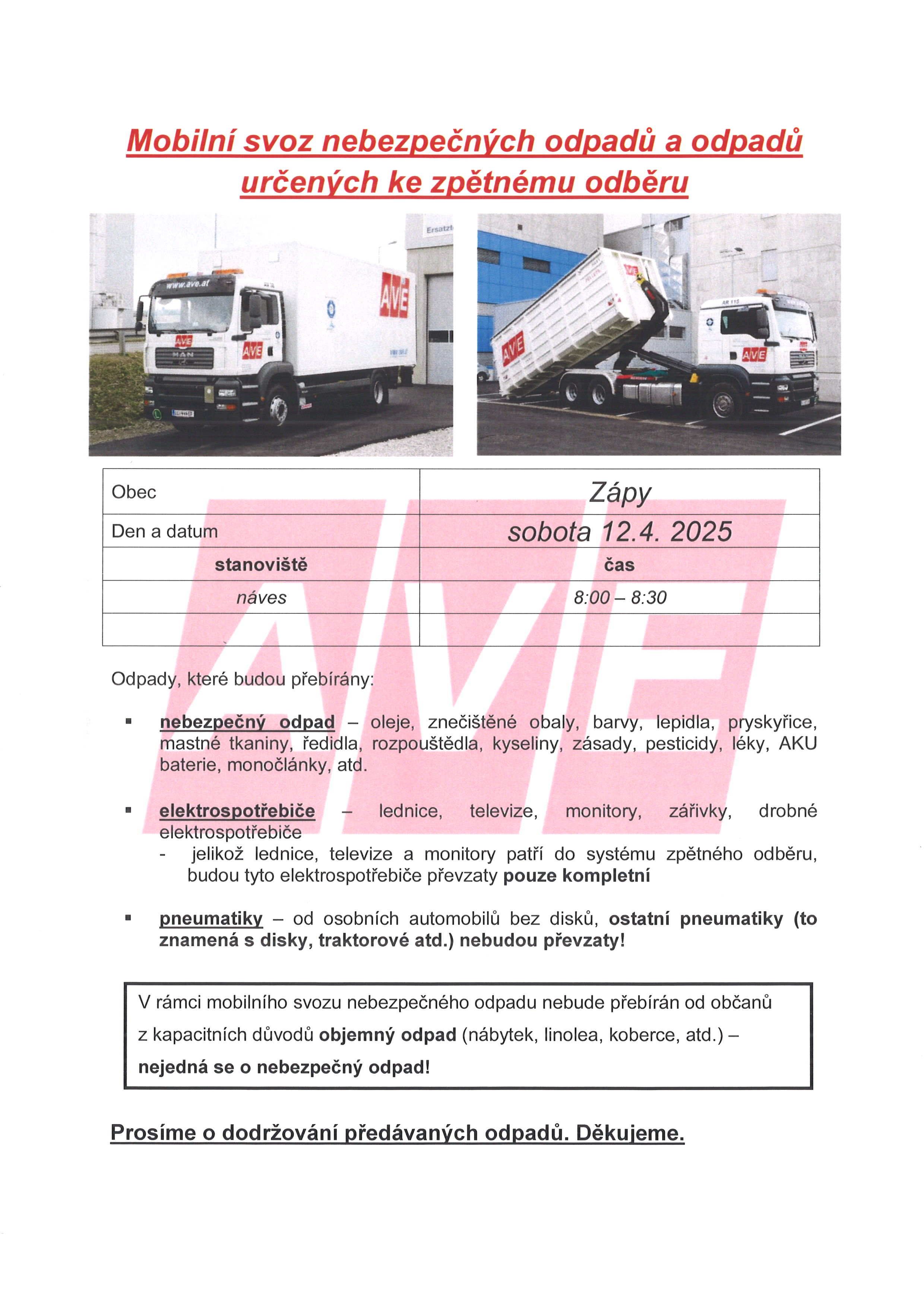 Mobilní svoz nebezpečných odpadů a elektrospotřebičů proběhne 12. dubna 2025 na návsi od 8:00 do 8:30. Přijímány budou oleje, barvy, znečištěné obaly, elektrospotřebiče a pneumatiky. Vyzýváme občany aby dodržovali pokyny k předávání odpadu a neodkládali objemný odpad. Na objemný odpad budou přistaveny kontejnery na obvyklých místech, u MŠ na Stránce a v Ostrově.